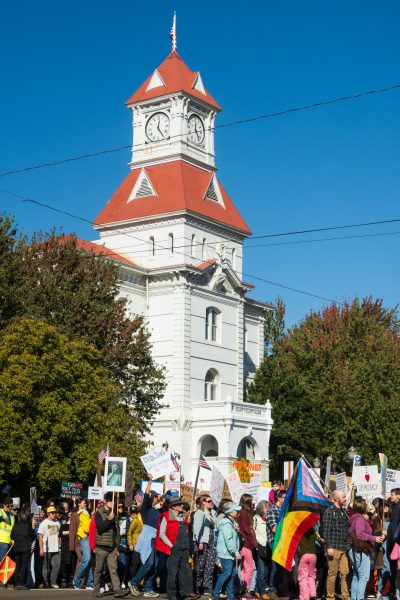 Though marchers came from different corners of Corvallis, they gathered under a shared purpose to reject concentrated power in government and society.